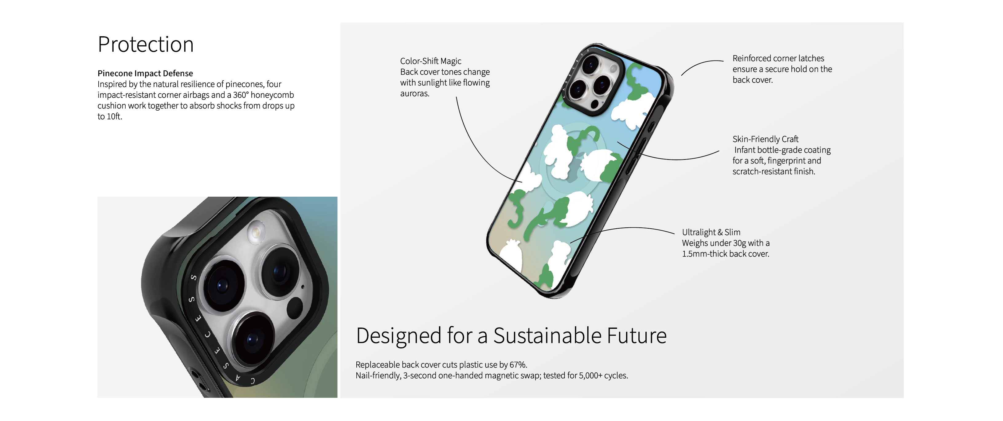 Reduce plastic waste by up to 67%. Swap the magnetic back cover, not the whole case. Style that evolves, sustainably.