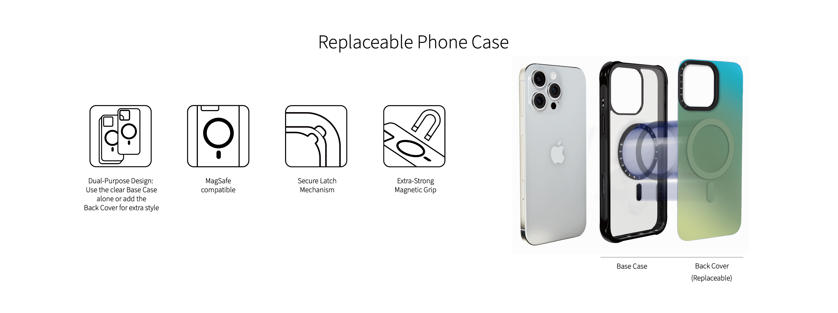Our replaceable system cuts plastic waste by up to 67%: simply swap the back cover for a fresh look without discarding the entire case. Use the transparent Base Case alone for a minimalist vibe, or attach a color-shifting Back Cover for effortless style changes.